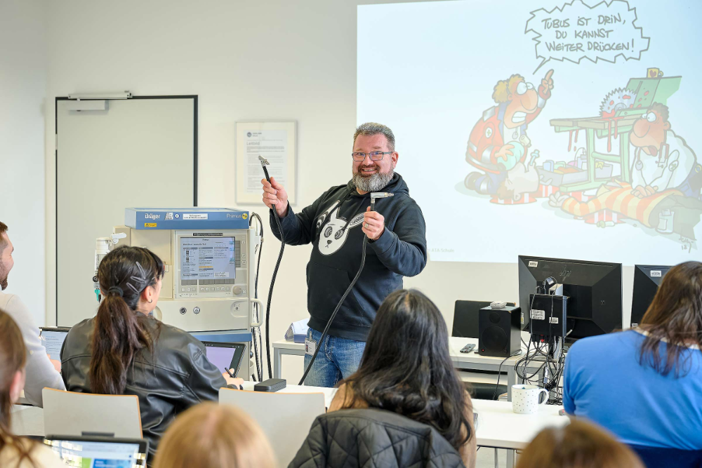 Pro Ausbildungsgang lernen an der ATA-Schule 20 Azubis in einem Kurs, die mit der Zeit zu einer echten Einheit zusammenwachsen. Wechselnd zu den Phasen der praktischen Ausbildung in den hochspezialisierten Operationssälen der Uniklinik wird der theoretische und fachpraktische Unterricht an der Schule für Anästhesietechnische Assistenz in mehrwöchigen Unterrichtsblöcken erteilt. Während der Praxisphasen werden unsere Azubis von qualifizierten Praxisanleiterinnen und Praxisanleitern begleitet.