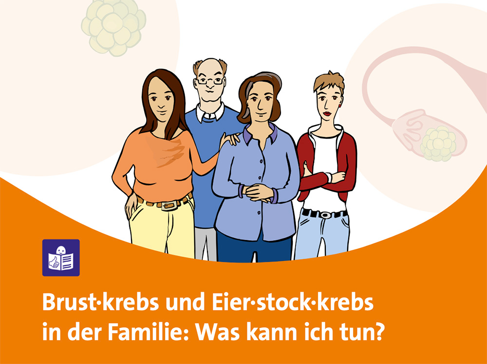 Aber: Nicht alle Menschen mit einer genetischen Veränderung erkranken zwangsläufig. Wie hoch das geerbte Risiko im Einzelfall ist, hängt unter anderem davon ab, welches Gen betroffen ist. Diese und weitere Aspekte zum familiärer Brust- und Eierstockkrebs, zum Beispiel auch zur Vorbeugung, Früherkennung und Behandlung, werden in der Broschüre anhand der beispielhaften Geschichte von Frau Müller und ihrer Familie erklärt. Die Broschüre ist in Leichter Sprache geschrieben. Dabei handelt es sich um eine spezielle Sprachform mit einem strikten Regelwerk, die es zum Beispiel Menschen mit Lern- und Leseschwierigkeiten erleichtern soll, die Texte zu verstehen.